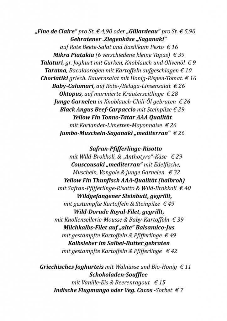 Die Speisekarte ist bei uns flexibel und passt sich wöchentlich an, je nachdem welche frischen Zutaten saisonal verfügbar sind. So können wir Ihnen stets die besten und frischesten Gerichte anbieten. Die vorliegende Karte dient als Beispiel, damit Sie sich einen Eindruck von unseren kulinarischen Kreationen verschaffen können.